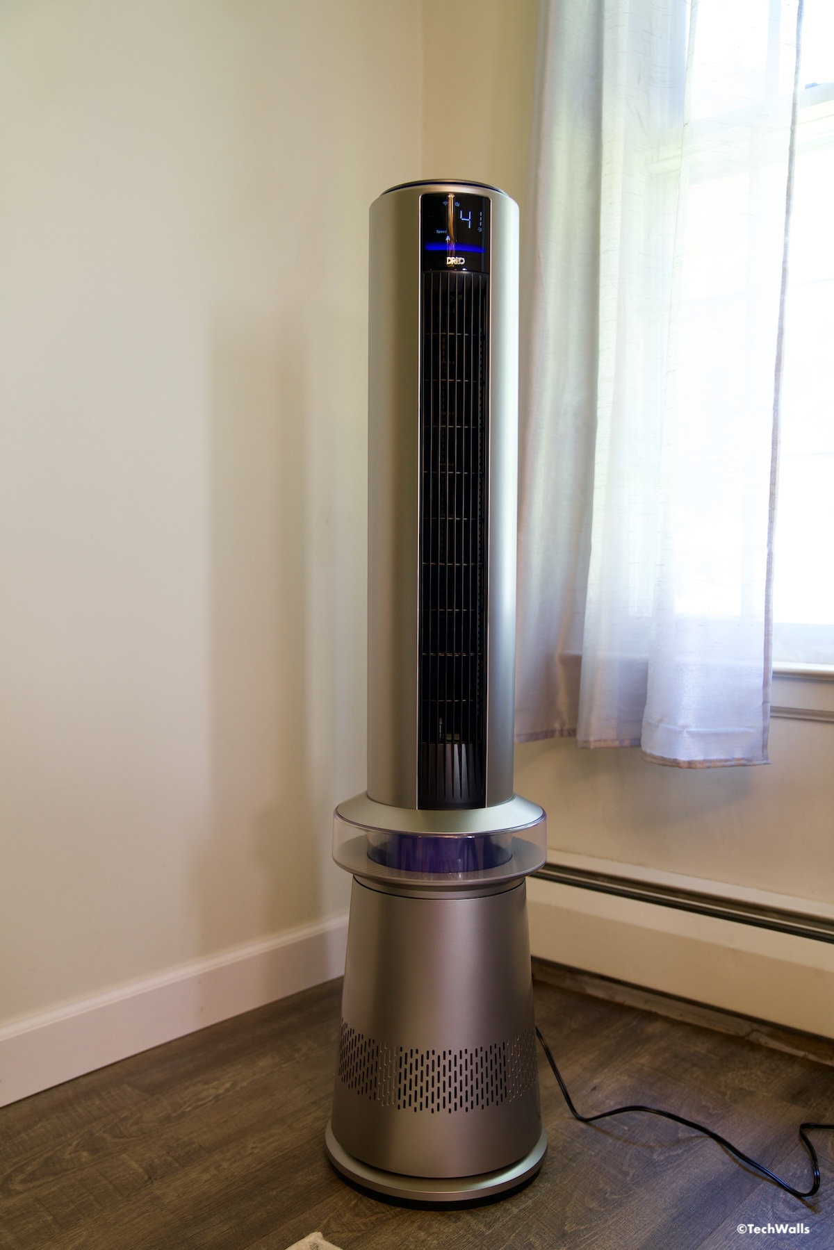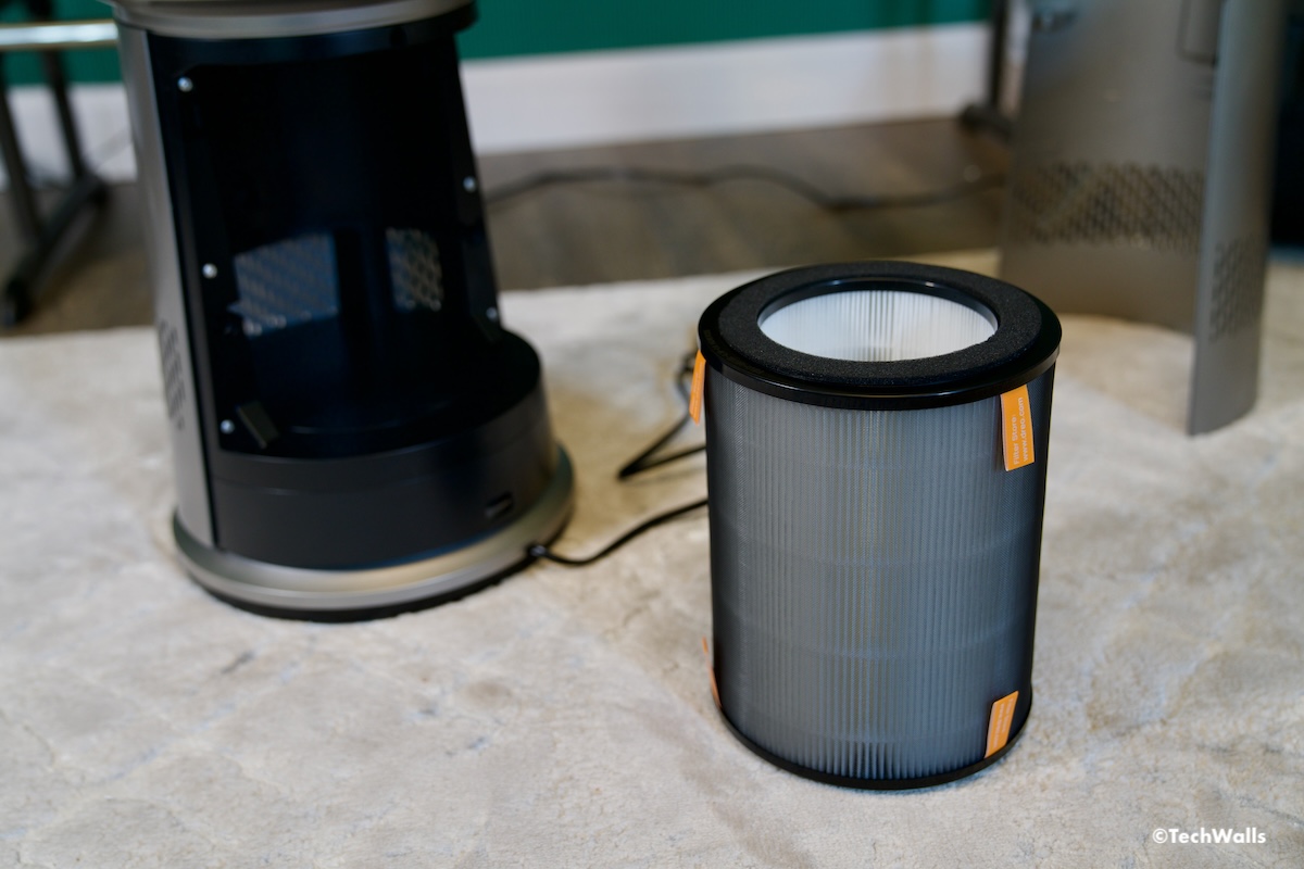 The unit features two brushless DC motors: one to draw in air from the bottom and another to oscillate the unit up to 60 degrees, effectively distributing clean air throughout large rooms. It is designed for spaces between 150 and 300 square feet. Similar to other air purifiers, it includes a HEPA filter capable of removing 99.97% of particles 0.3 microns or larger, such as bacteria, pollen, and smoke. Unfortunately, it lacks an activated charcoal filter, which would help remove odors and organic vapors. This is quite disappointing because I love the charcoal filter and almost all air purifiers have it.
