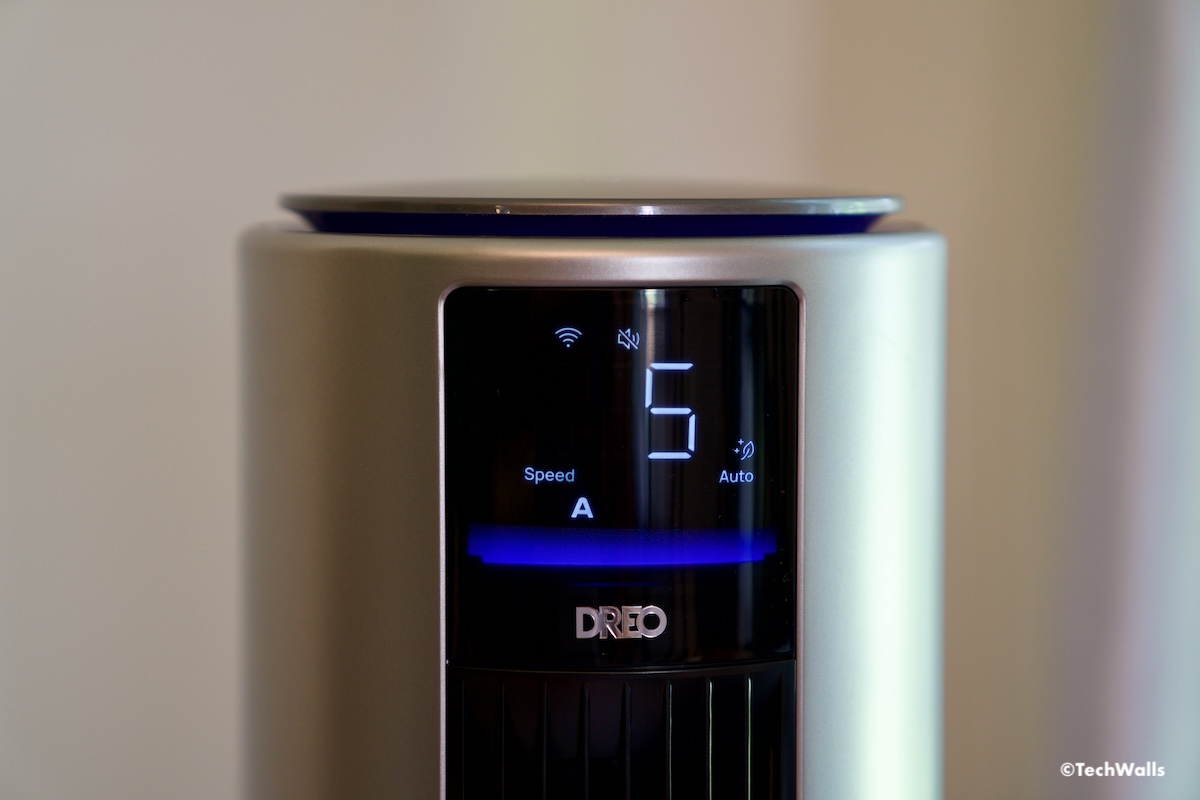 The fan features an intuitive touch interface on the top panel for setting up Wi-Fi, choosing operation modes, and displaying air quality levels, fan speed, temperature, and filter life. The included remote control and Dreo app allow for remote adjustments and real-time monitoring of air quality. The app also supports voice control via Alexa and Google Assistant.
