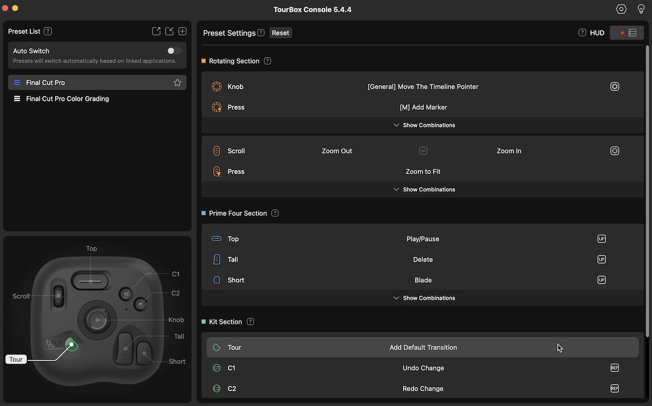 I’ve found the main knob most useful for scrubbing through the timeline in Final Cut Pro, or changing the size of a brush in Photoshop. The mouse-like wheel at the top left I’ve assigned in Final Cut Pro to zoom in and out of the timeline, and press on the wheel to fit the whole timeline to the window. The large buttons, Tall and Short, can be assigned to Delete and Blade respectively. The C1 and C2 buttons are assigned to Undo and Redo which are extremely helpful. If you need to make any change, you will just need to click on the button, find shortcuts in the list or just press the shortcuts that you want to assign to that button. You should tweak the presets over time for the most used commands, instead of trying to set them up all at once. If you happen to forget functions of any key on the Tourbox, you can turn on the HUD which shows all keys/combinations and their corresponding functions on the right side of your screen.