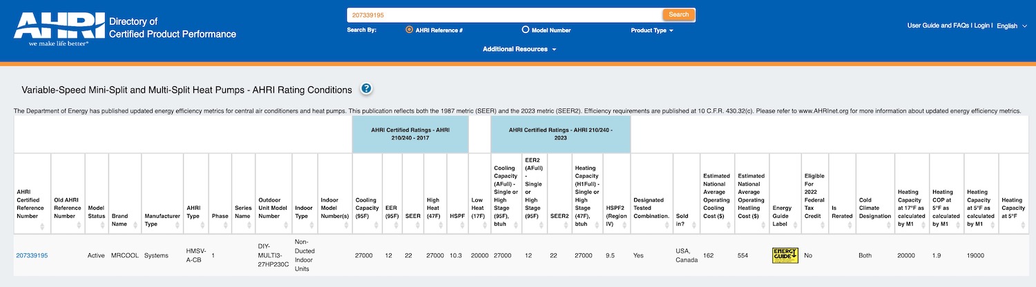 Many MRCOOL systems do not meet the efficiency requirements and therefore, don’t qualify for the federal tax credit yet; You should always check ENERGY label before making the purchase. For instance, the MRCOOL DIY 4-Zone 36,000-BTU mini split has the SEER2 of 21.5, EER2 of 10.5, HSPF2 of 8.8, and heating COP of 2; The HSPF2 is lower than 9.5, so you can’t claim tax credit for this system in the North. To check which system qualifies, you can visit the rebate center on MRCOOL’s website. Another way is to look it up on AHRI Certification Directory, the AHRI reference number of a specific model can be found on MRCOOL’s website.