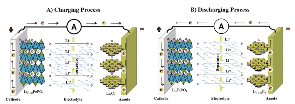 For all the science geeks out there, its anode material is LiaC6, and the cathode material is LibFePO4, with the carrier being Li+.