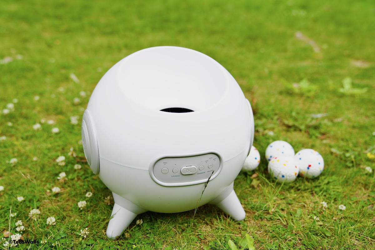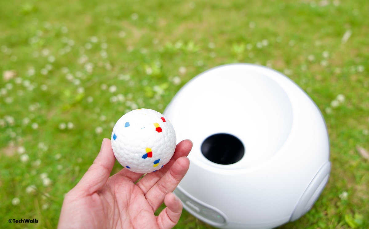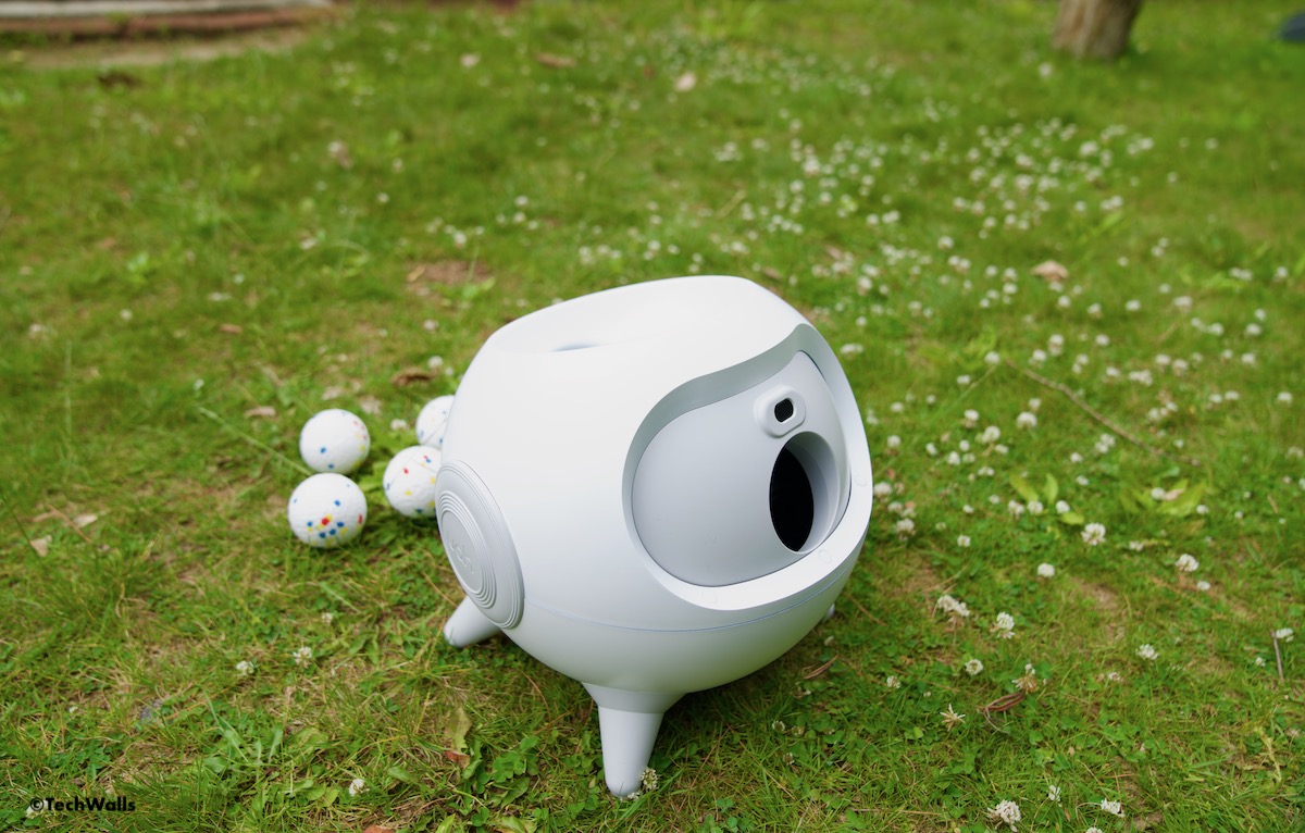 - Playball interactive ball launcher: The Playball interactive ball launcher is a cheaper option. It can be used indoors or outdoors and is powered via an AC adapter or 6x C batteries. It can be adjusted to Near, Middle, or Far depending on where you plan on using it. However, it doesn’t have the intelligent avoidance system or automatic shooting angle adjustment feature and uses smaller 1.5″ mini tennis balls.