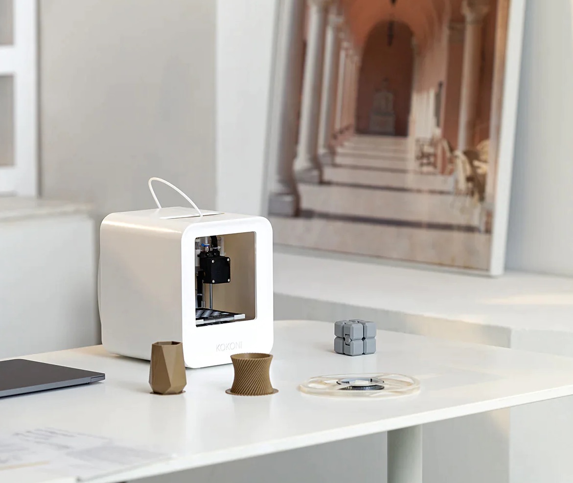 The KOKONI EC-1 features a compact and minimalist design, with an elegant combination of technology and aesthetics. Its sleek white case is designed to blend seamlessly into any work environment or home décor. Whether it’s for DIY home decor or practical gadgets, the EC-1 is a versatile and powerful tool for anyone interested in 3D printing.