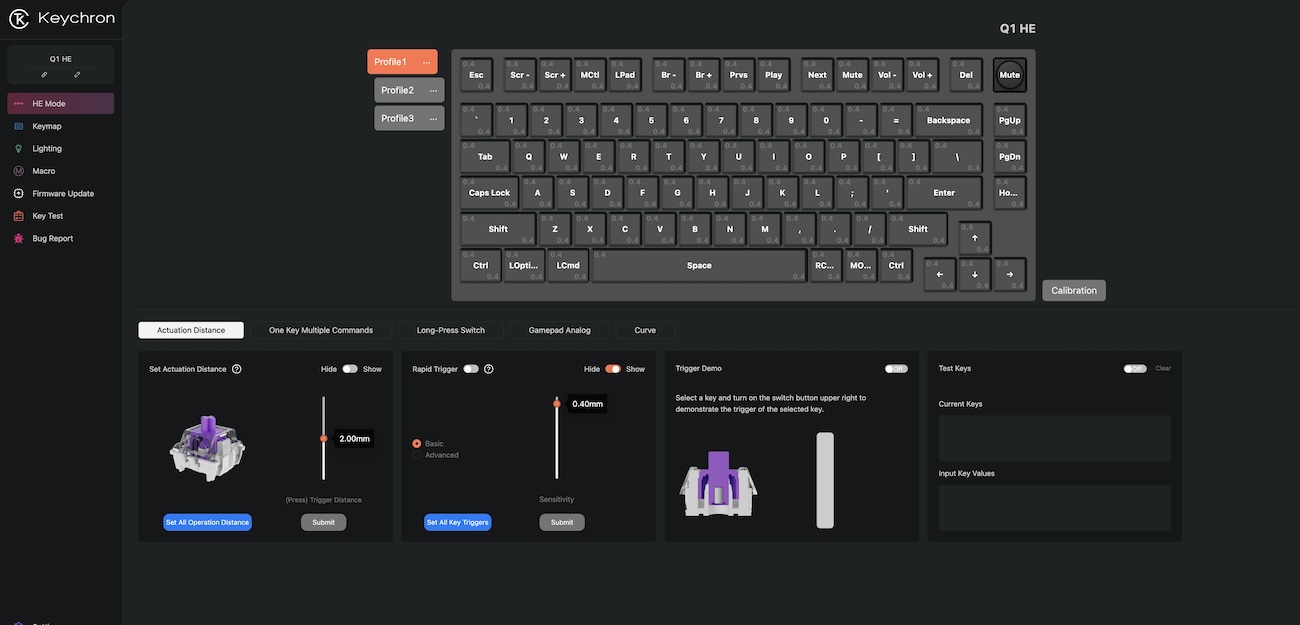 Users can adjust the actuation point – where the keyboard registers a key press. This adjustability can enhance typing responsiveness or reduce accidental keystrokes, depending on your preference. The Q1 HE takes full advantage of this technology, offering an actuation range of 0.2 – 3.8mm with a sensitivity of 0.1mm. The short trigger distance is hugely beneficial to gamers but it could cause a lot of accidental keypresses when you type, so you should create multiple profiles for different purposes. This fine level of control is accessible through Keychron’s web-based customization app, Keychron Launcher.