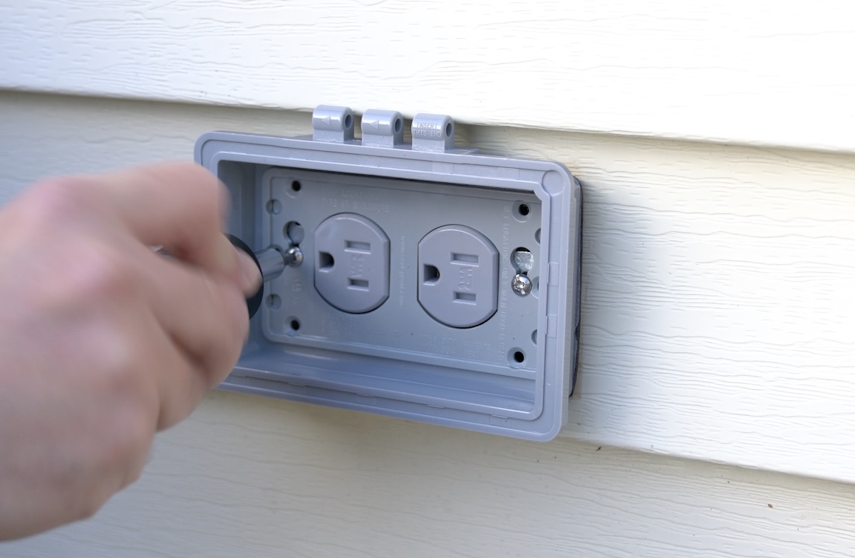 Unscrew and remove the current outlet cover. Inspect the outlet box for any dirt or debris and clean the area to ensure a good seal for the new cover. If you see any sign of rust on the receptacle, you should replace it with a water-resistant one.