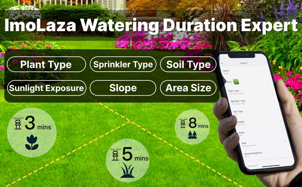 ImoLaza’s unique super water-saving mode; Automatically generates watering duration and intelligently adjusts watering frequency with weather, season, and climate changes; Ensure healthy lawn growth while maximizing water conservation.