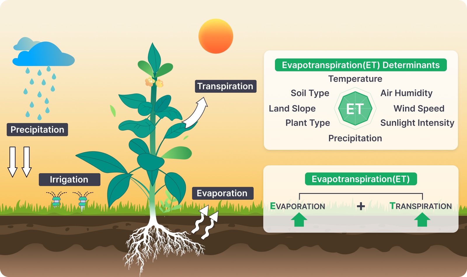 Intelligent ET Master constantly analyzes and records the natural evaporation and plant transpiration in your lawn by monitoring the actual weather data 24 hours a day, including temperature, air humidity, wind speed, Sunlight intensity, and precipitation, powered by the Smart Weather Genius. With this information, it calculates the soil moisture level and actual water needs of your lawn.