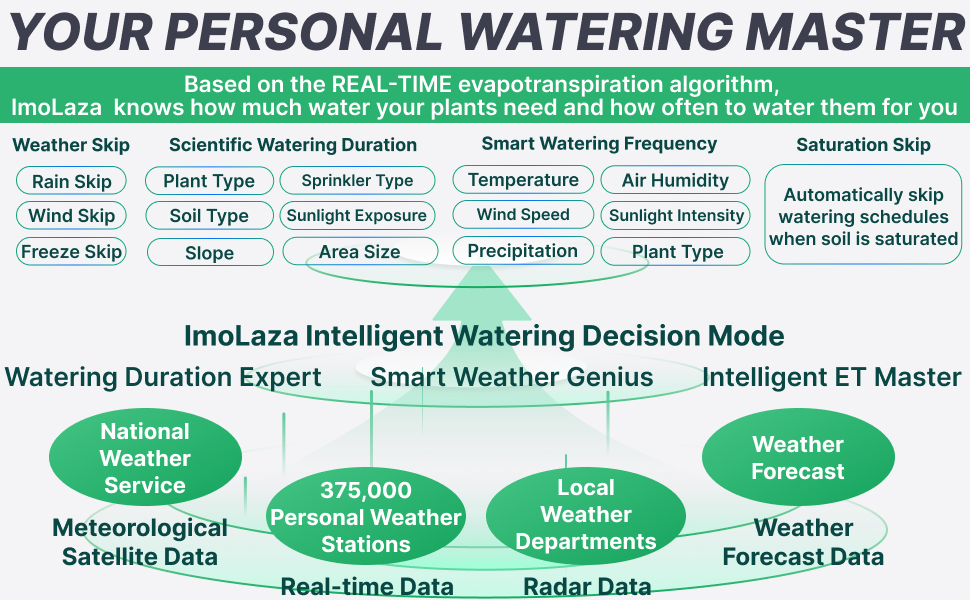 ImoLaza Intelligent Watering Decision Model™ integrates the power of three cutting-edge core technologies: Watering Duration Expert™, Smart Weather Genius™, and Intelligent ET Master™, creating the world’s most advanced smart irrigation system. It allows you to effortlessly and flexibly create watering schedules that meet any irrigation requirements, and with the precise smart weather system, it ensures automatic skipping of watering during adverse weather conditions, protecting lawn health while maximizing water conservation.