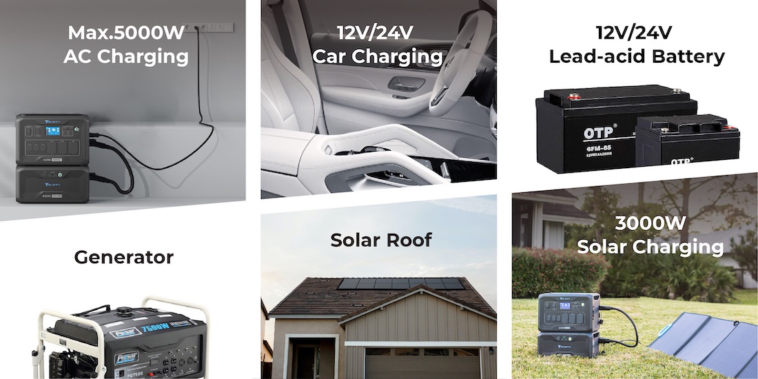 The power station uses a safe and reliable LiFePO4 battery for long-term durability and over 3,500 charging cycles to 80% of its original capacity. You can expect to use it for over 10 years. It can be charged by AC, solar, generator, lead-acid battery, dual, or triple charging methods. If you are recharging with 3,000W MPPT solar panels, the charging time for AC500 with two B300S is about 2.5 hours.