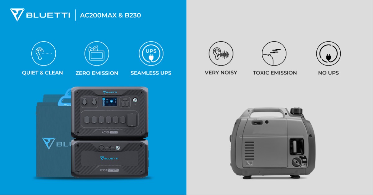 Last but not least, most heavy duty gas powered generators can weigh hefty amounts, sometimes up to 250 pounds. While Bluetti’s heavy duty solar powered AC300 weighs a mere 44 pounds and the external battery B300 weighs 74lbs in comparison. Obviously, the less powerful the generator the lighter it usually weighs but in summary, solar generators are way more easier to move around than gas powered generators for the same amount of power density.