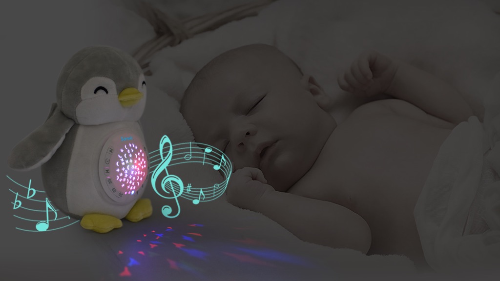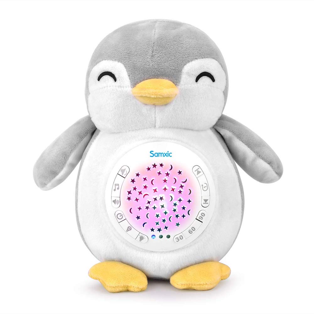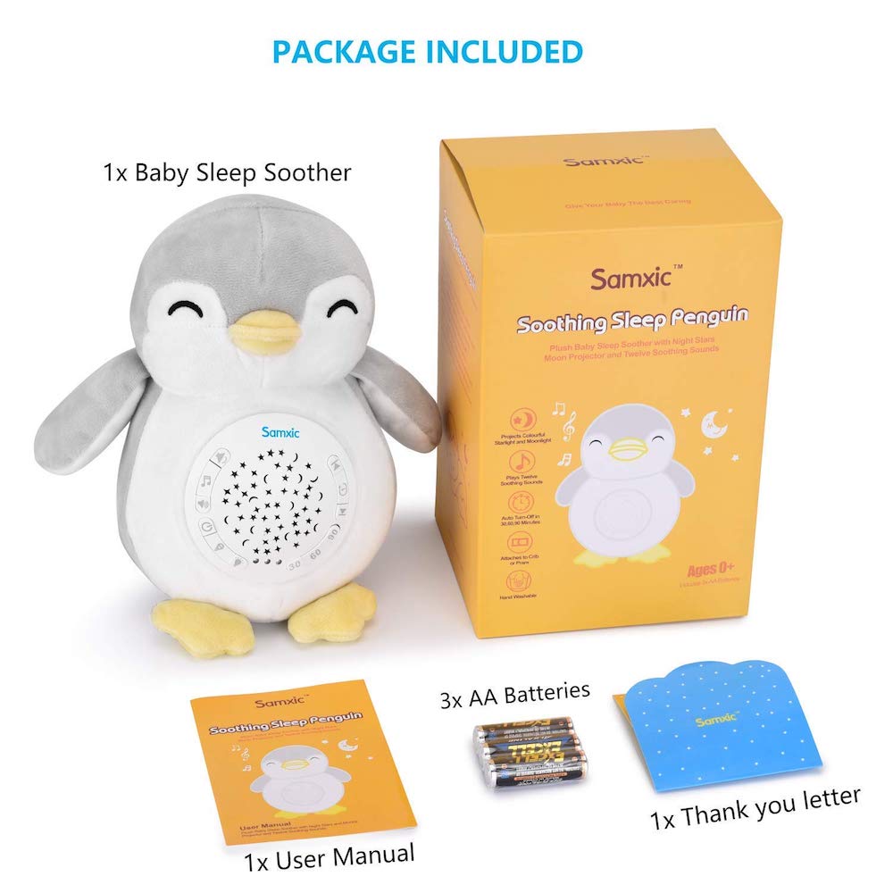 The sleep soother is made like a stuffed white penguin and it looks quite adorable. It can play 12 soothing sounds including white noise, in utero sounds (mimics the womb sounds), hair dryer, birds, ocean wave, rain, and 6 gentle lullabies.