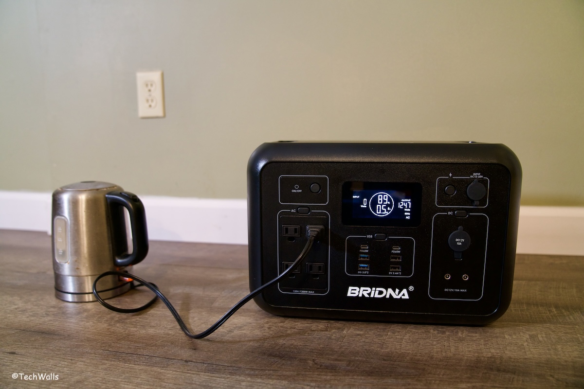During my testing, the BRIDNA PPS1200-3 demonstrated reliability and efficiency. With 1,200W max power, it efficiently powered a variety of appliances, such as a large TV, my work setup including a laptop and a monitor, a water boiler, or a small space heater. The unit’s safety sensor tripped when overloaded, but this was easily reset, showcasing its built-in safety features. The power station is good enough for essential devices and you shouldn’t expect to use it with your power tools or other demanding appliances.