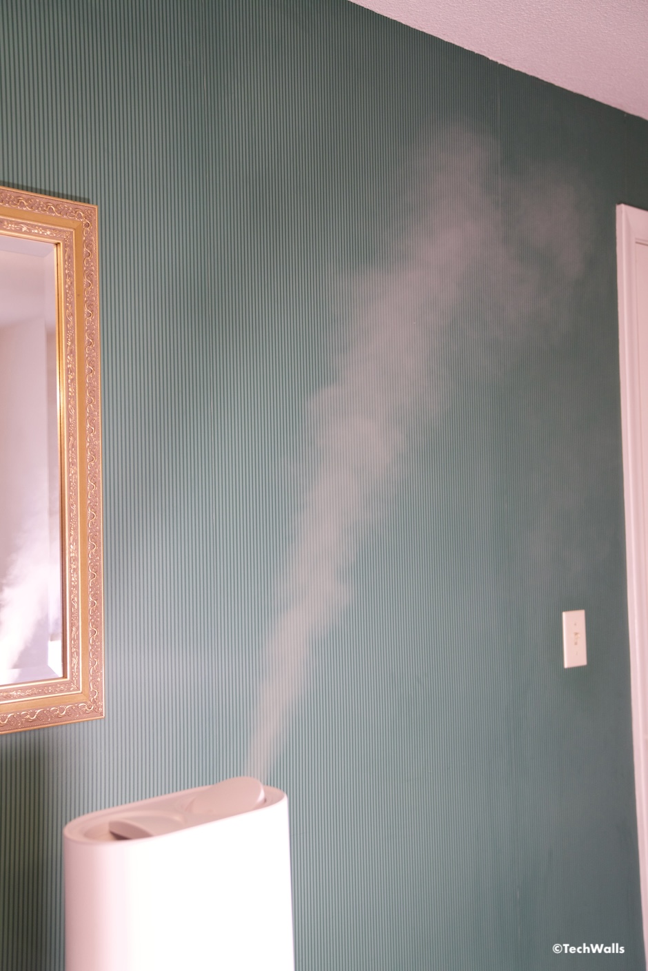 Another advantage is that it can spray mist up to a height of 40 inches from the head, so your table won’t get wet like with other humidifiers. The mist height is around 38″ in level 5 and can reach 42″ in the BoostMist® mode.