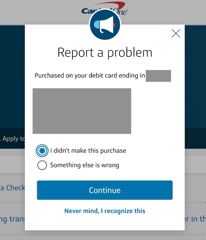 Someone might have stolen the card info when I used it a long time ago and now started spending my money. He bought groceries from Walmart so he could pick up and avoid revealing his address. I looked up for ways to dispute these transactions and Capital One actually makes it quite easy on its Online Banking page. I just went to my checking account, click on the fraudulent transaction to expand it and click on “Report a Problem” to start a dispute process. Capital One will ask you to confirm you didn’t make this purchase, it is not made by other authorized account users, and not a subscription or recurring transaction.