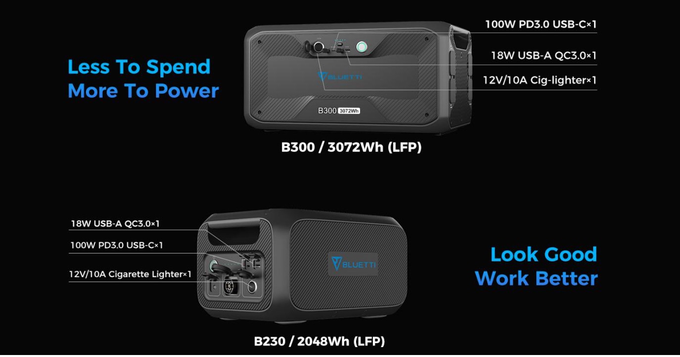 Bluetti is proud to announce the latest “industry first” innovation, the modular power products that are the B230 and B300. Both the B230 and B300 can be charged and discharged as a standalone power module and both feature various DC outlets, including a 100W USB-C, a 12V/10A car output, and some USB-A ports.