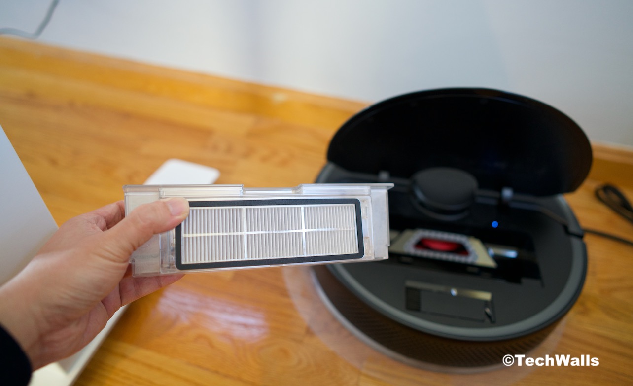 Opening the top cover reveals a blade brush to untangle the rolling brush and a 460ml dustbin. The bin is quite spacious and you don’t need to empty it after a couple of days. There is a HEPA filter to trap fine dirt and it should be replaced after a few months. I’m surprised that there is no extra filter or mopping pad in the box.