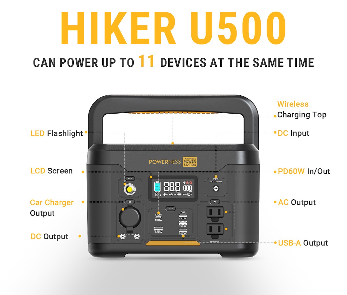 The Hiker U500 has the perfect size if you are looking for a portable power station. This is a rechargeable lithium-ion battery-based power station that is designed to provide you with a durable and long-lasting portable power source. With a capacity of 515Wh (34.8Ah, 14.8V), this power station is the perfect companion for your outdoor adventures, camping trips, and emergency situations. The power station is lightweight at only 5.2kg and comes with a foldable handle that makes it easy to store and transport. It is also made with Grade-A battery and chips and is equipped with layers of protection that provide peace of mind and safety.