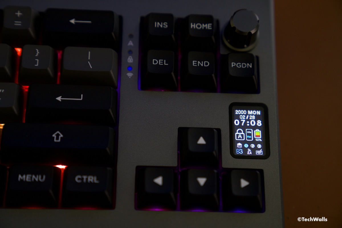 With switch options like the Epomaker Flamingo, Gateron Pro Yellow, Epomaker Budgerigar, and Epomaker Bluebird, users are spoilt for choice. In terms of design and build, despite its plastic composition, the keyboard exudes an aluminum-like charm, weighing in at a solid 900 grams. The Shadow-X stands out not just in build, but also in design aesthetics with significant head and chin bezels. Adding to its unique character are features like a rotary knob and an LCD screen neatly placed above the arrow cluster. The knob is for switching between connection modes only and we can’t use it for volume control.