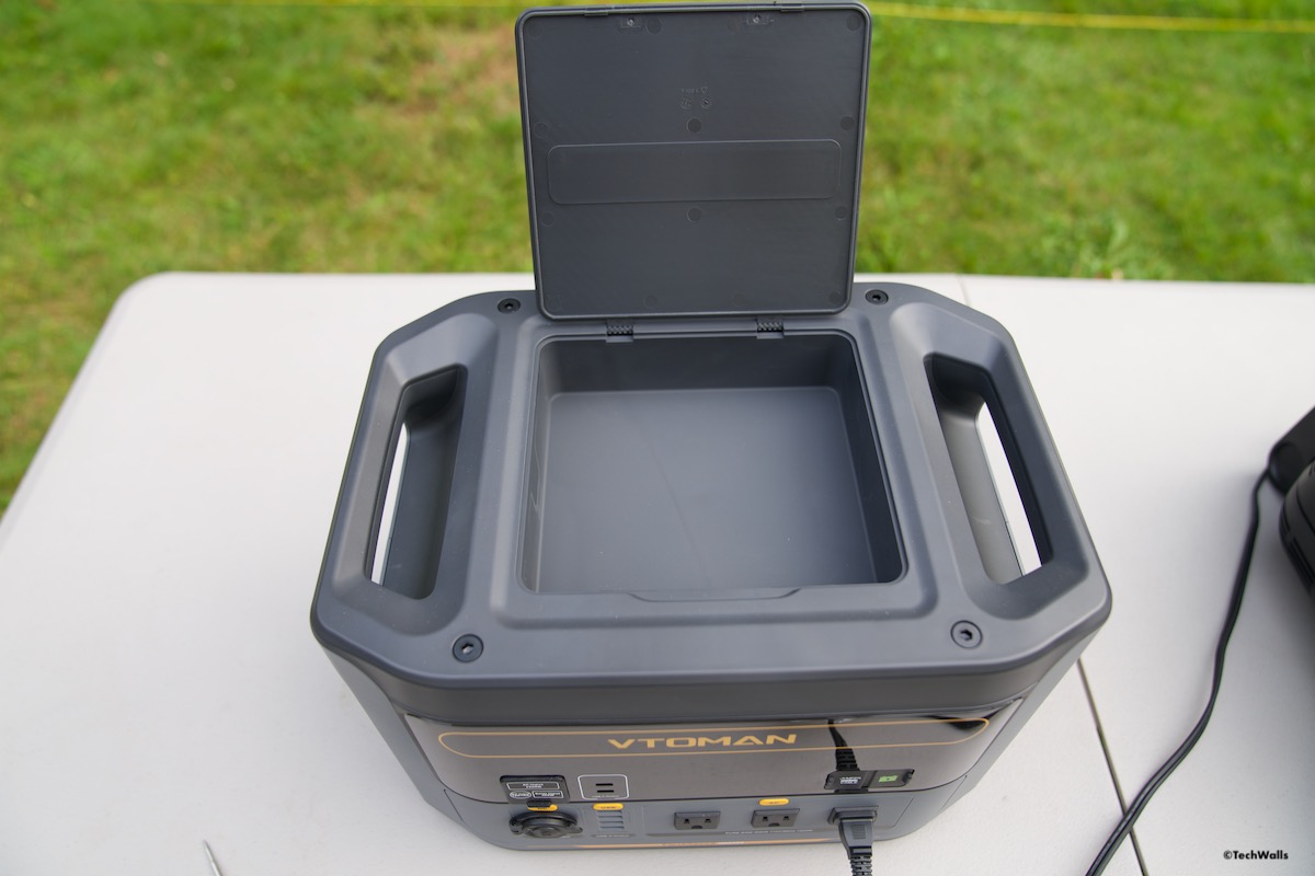 The VTOMAN FlashSpeed 1500 is certainly not for the faint-hearted, weighing over 41 lbs and resembling an oversized car battery. With sturdy carrying handles on each side, it is not a problem carrying the power station over a short distance, but any considerable distance would prove challenging. Its design is one of its strongest points. The flat top allows for stacking and also features a handy storage compartment for charging cables – a design choice I find more useful than wireless charging.
