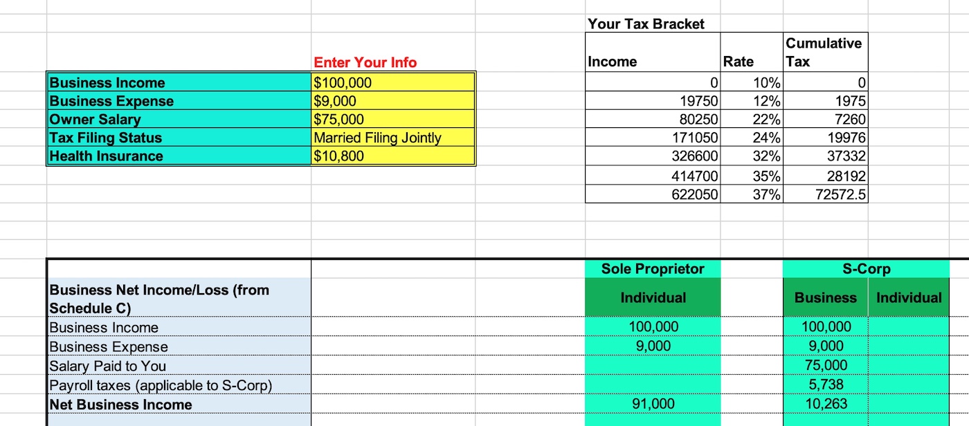 So, choosing between sole proprietorship and S-Corp is not an easy decision because it depends largely on your earnings and salary. You will need to do your own calculations to figure out which business entity has more tax savings for you. I’ve made an Excel spreadsheet for myself to make the work easier. You will just need to enter your business income, expenses, salary, choose filing status, then the spreadsheet will do all the calculations and you can check out the total taxes at the end. You can get the Excel spreadsheet here for $25 (I will process your order within 24 hours). Make sure to consult with your tax advisor because this is a complex issue; I made the spreadsheet for my own use. I’ve updated the spreadsheet for tax year 2023; The due date for filing tax returns and making payments is April 15, 2024.