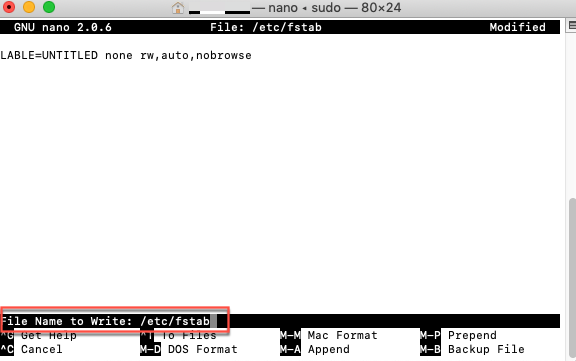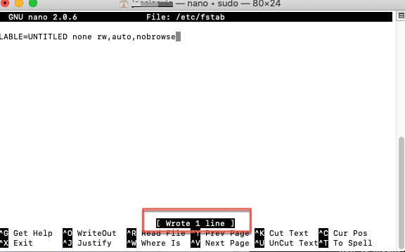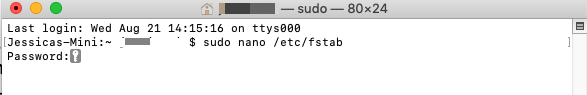 Step 2: Type “sudo nano /etc/fstab” into the Terminal to open the /etc/fstab file for editing nano text editor.