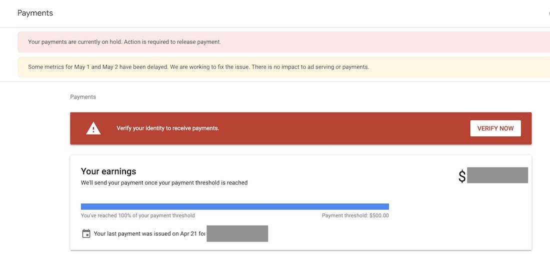 I’ve got a lot of issues with my Google Adsense account lately. A few weeks ago, I got a problem with payment methods and now I see another alert saying: “Your payments are currently on hold. Action is required to release payment.”