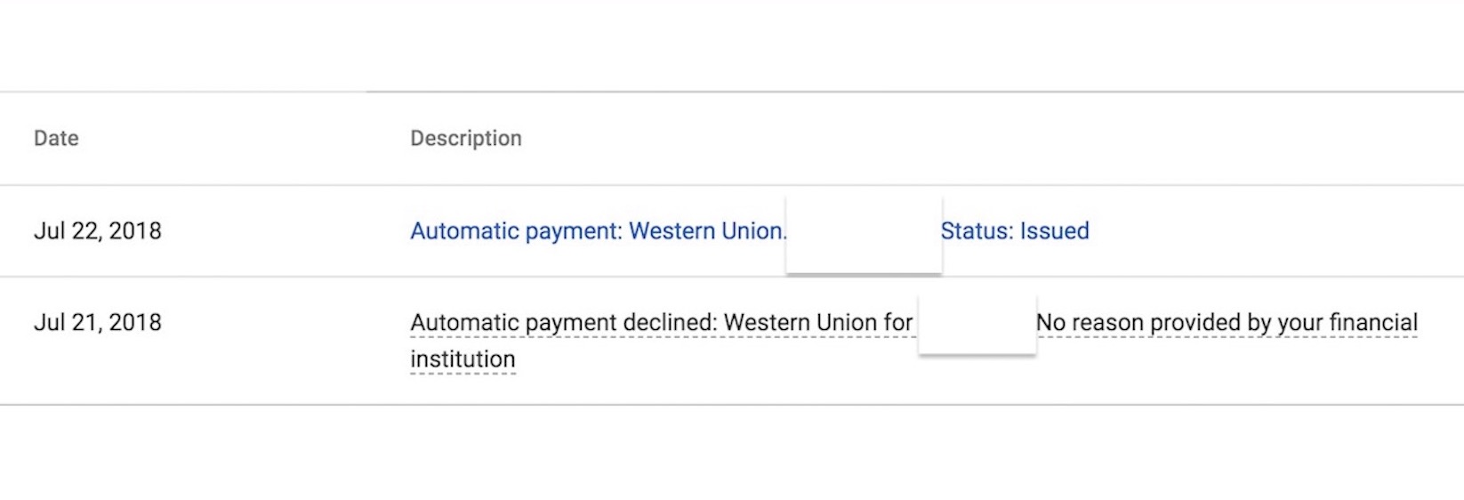 Automatic payment declined: Western Union for $xxxx.xx. No reason provided by your financial institution