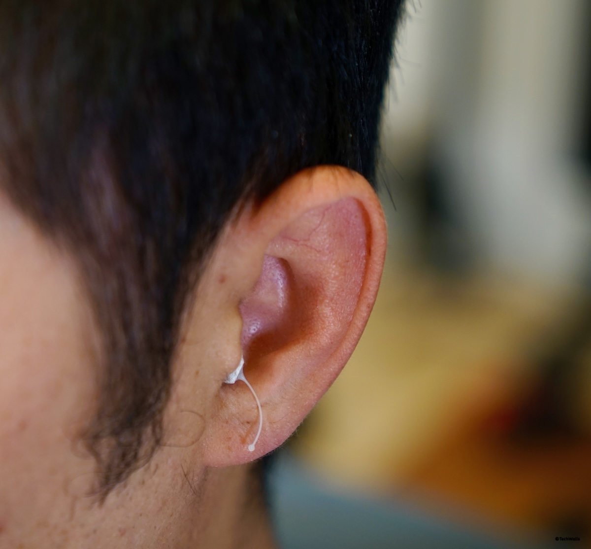 The first noticeable feature of the Core One is its incredibly small size, weighing only 0.96 grams each, making them one of the smallest hearing aids available. The glossy white design ensures they fit entirely into the ear canal, rendering them almost invisible, with only a small recovery thread sticking out for easy retrieval.