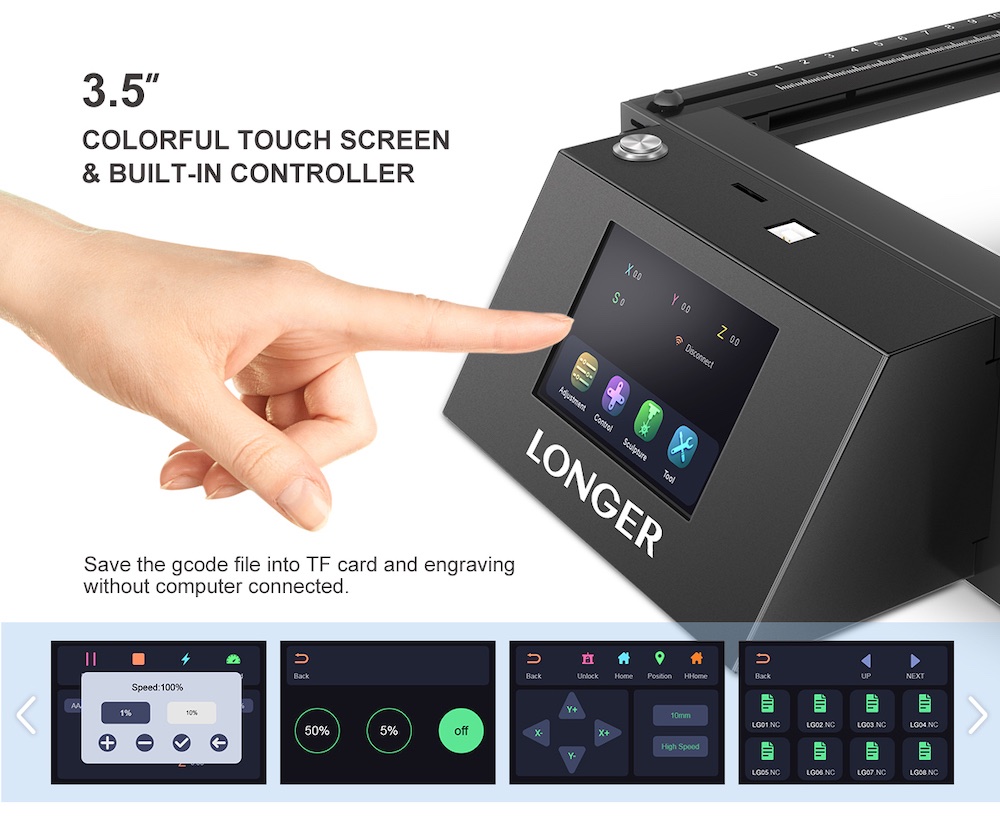 Despite being a budget engraver, the Longer RAY5 has some features that are found on some expensive machines. It includes a built-in touch screen which allows controlling the engraving process easily and we don’t have to rely on a separate controller. It even doesn’t require setup with your computer; You can just save gcode files to an SD card, insert it to the machine, adjust settings on the touch screen, and start engraving. This feature is extremely helpful for beginners who don’t want complicated setup processes. Most similar products in the price range requires a USB connection to a computer. Since the machine can be used offline, it is powered by a 32-bit chipset (operates at 240 mhz) which helps run different functions smoothly on the touch screen. You can check out the video below to see how it works: