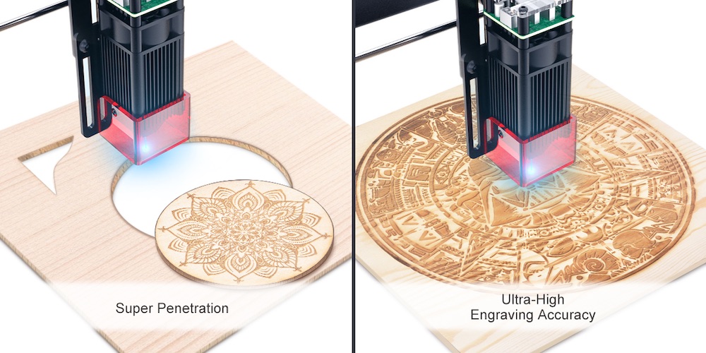 The machine uses FAC laser technology to compress the laser spot to the size of 0.08 x 0.08mm. This is significantly smaller than 0.15mm x 0.15mm spot size found on many other engravers. Since the spot is smaller, the energy is more focused and accuracy is improved. A 10W laser head is expected to be released in May and you can purchase the more powerful head separately then. There are some small plywood pieces inside the box, so you can make quick tests with the machine.