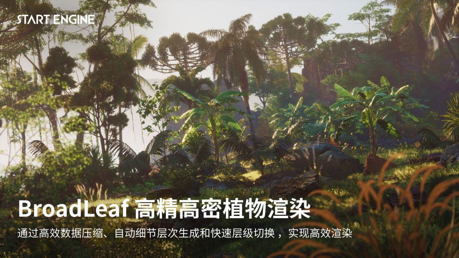 What’s more, trees and leaves rendered by START ENGINE can even achieve monolithic interaction. Relying on the cloud computing platform, BroadLeaf makes it possible to add large-scale cinematic level tree scenes to real-time games, which greatly improves the richness and real-time of game scenes.
