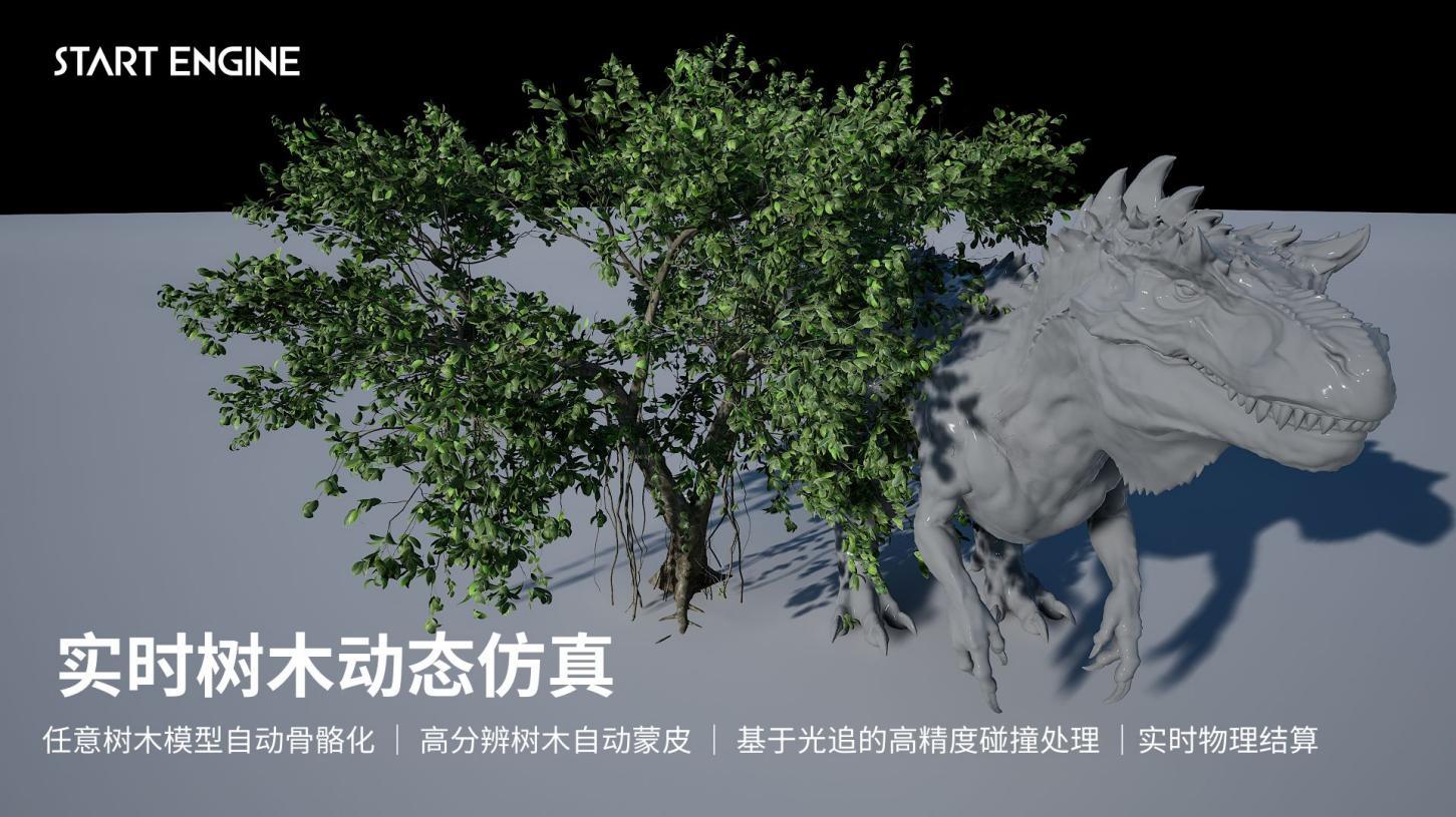START ENGINE takes advantage of the computing power of multiple graphics cards on the cloud to achieve real-time high-precision tree simulation in native cloud games based on GPU acceleration technology. Hardware ray tracing technology is used to perform accurate physical collision detection, which is quite satisfactory. When trees collide with high-precision models, accurate physical feedback can be obtained in real time, which further improves the physical performance in the real-time field.