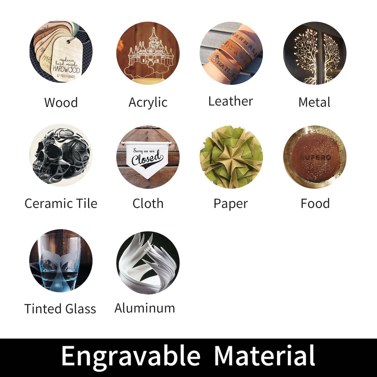 | Available Materials of Engraving | Wood Board, Paperboard, Black Acrylic, Leather, Food, Stainless Steel, Power Coated Metal, etc. |