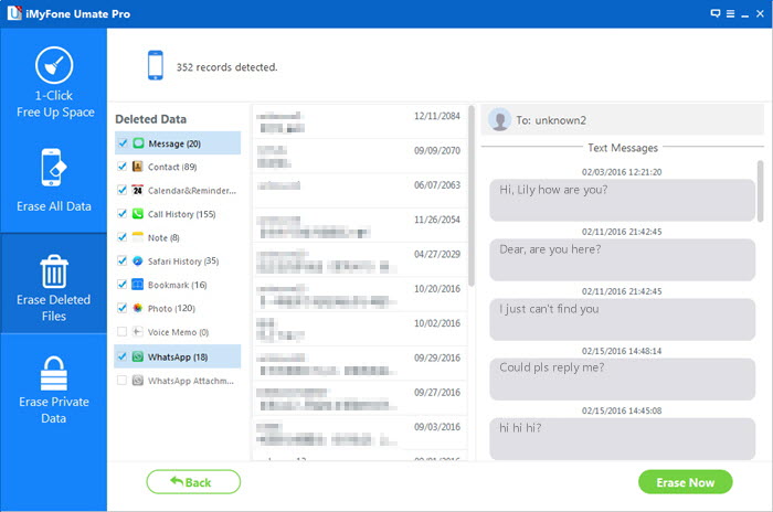 Step 2: Preview all deleted files one by one, tick the corresponding box for the ones you would like to permanently delete and then click on “Erase Now” to erase the ticked files. iMyFone Umate Pro may choose all the deleted files by default but you can do some multiple selections.