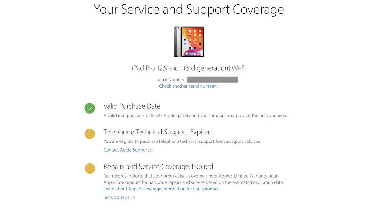 Notice that this is not the refurbished iPad from Apple which is much more expensive, therefore, it doesn’t include a 1-year warranty from Apple and I also can’t buy AppleCare+. When I checked its serial number on Apple for service and support coverage, both of the service coverage and telephone support were expired. Considering the fact that the product was released just a year ago and all new iPads come with a 1-year limited warranty, it seems like these iPads have never had warranty in the first place or it was voided by Apple.