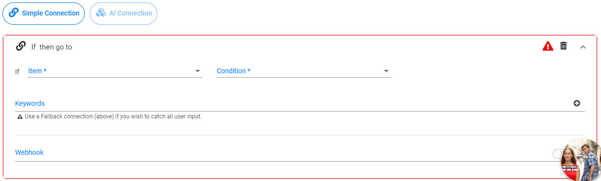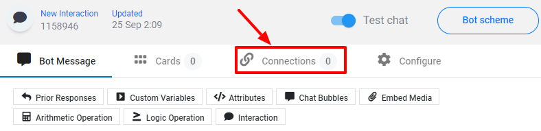 A simple example of how you can use interactions and connections is when your chatbot pops up to visitors and asks them if they need help. If they say “yes,” then you can direct what the bot will do, and if the answer is “no,” you will add different actions.