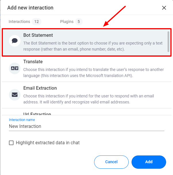 For now, click on “Bot Statement.” It is the simplest interaction, and it’s best for helping beginners understand what they are doing.