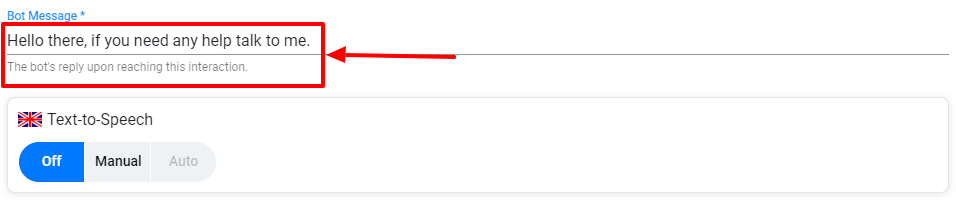 By clicking on the interaction, you will see a lot of editing options located on the right side of the screen. The best place to start is by adding the statement that the bot is going to say when the interaction is made.