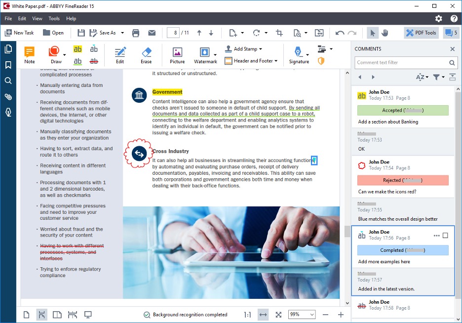 One of the major issues with PDFs is that the formatting is lost when you copy-paste content. FineReader solves that issue and gives you accurate copy-paste capabilities without sacrificing content integrity. There are also extensive tools for reviewing and commenting on PDFs, as well as the ability to remove hidden data prior to sharing documents. You can also merge documents of different file types into a single PDF, a feature seen in only a few other PDF editors like Acrobat Pro DC and Wondershare PDFelement (both reviewed above.)