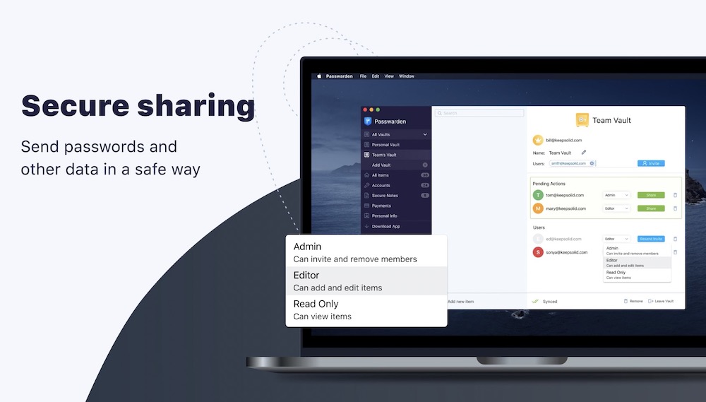 This is another premium feature that free password managers don’t have. Sometimes you need to share login credentials with your family or friends. Rather than copying and pasting to emails or messages, Passwarden makes it much easier and safer. Besides, the passwords are always updated to the most current one, so you only need to share once. You can assign role with different permissions to each person whom you’re sharing the passwords to.