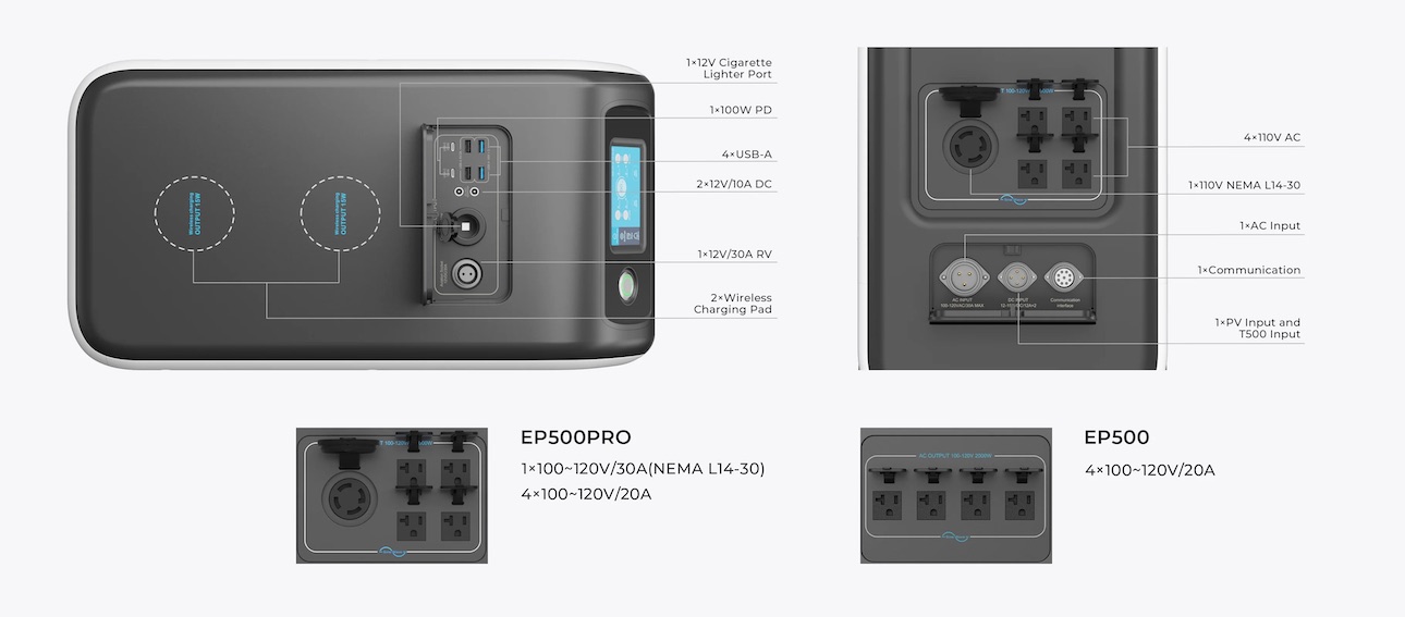 The 2 power stations are equipped with the same battery capacity of 5,120Wh with 4 power outlets. However, only the EP500 Pro features a NEMA L14-30 30A receptacle that provides up to 3,000 watts of continuous power at 120V. That is powerful enough to run most of your home electronics and appliances during power outages. Besides, the Pro has an additional 100W USB-C port; The two USB-C ports are very helpful for charging your laptops, iPads, or smartphones.