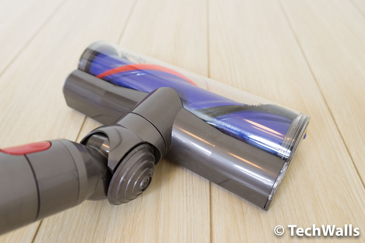 Most of the time, I use the vacuum with the wand and soft roller head to clean hard floor. Of course, you can use the direct-drive head but the soft roller head is much more efficient on the wood floor. The head is covered in soft woven nylon and carbon fiber filaments. Even in normal mode, the head can pick up fine dust and large debris very well. When I turn on the max mode, the rolling speed of the head is the same but the suction is a lot more powerful. The vacuum basically sucks everything, including fine dust, cereal, or snacks in one drag, so I’m totally satisfied with its performance. You can see it in action in the video review above.