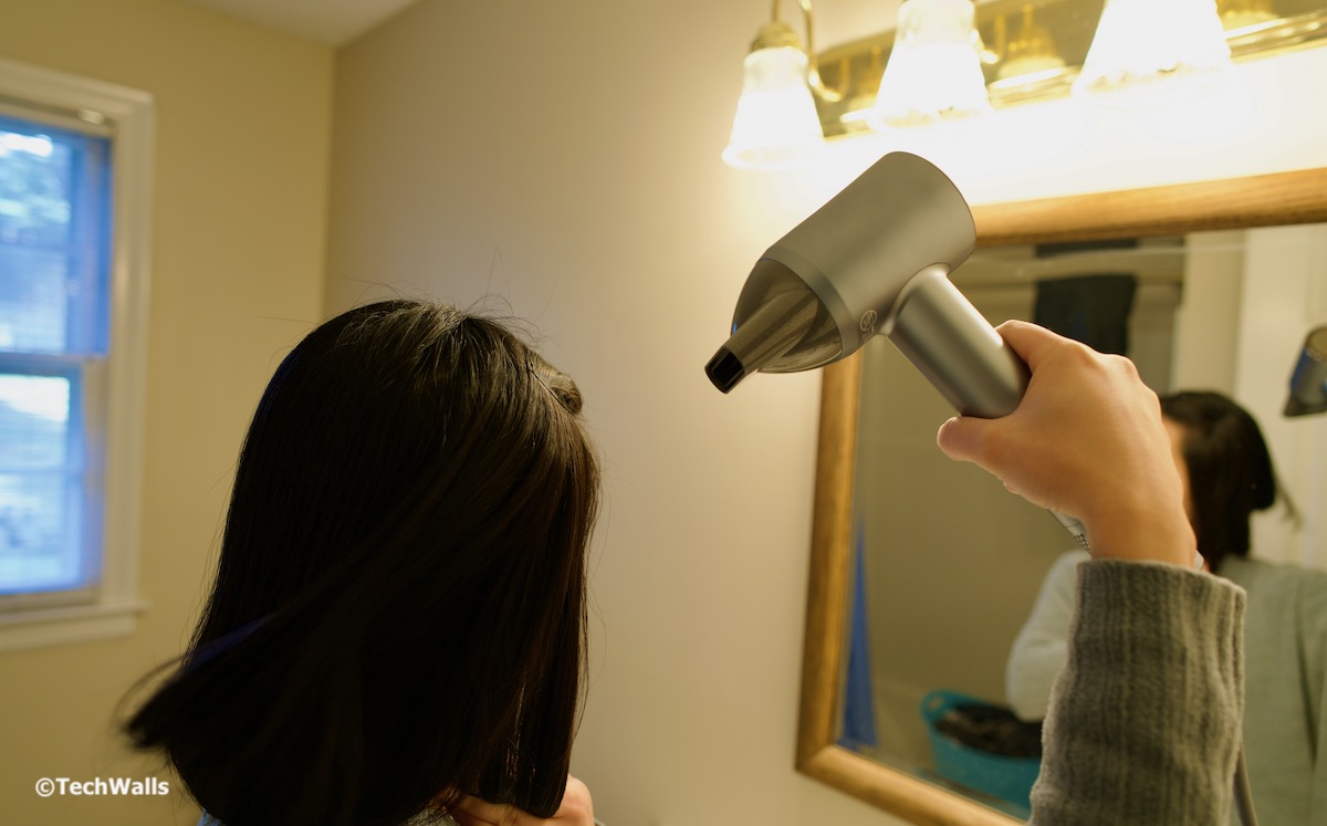 My first impression with the hair dryer is that it is so compact and lightweight. It is powered by a tiny yet powerful 110,000 RPM high-speed brushless motor that is placed inside the handle. This design makes the hair dryer even lighter and easier to maneuver. The Tensky can completely dry my short hair for 3 minutes and my wife’s for around 6 minutes; This is quite impressive as compared to traditional dryers that we used before. I also love the sleek design with a mirror on the back and RGB lighting indicating temperature setting.