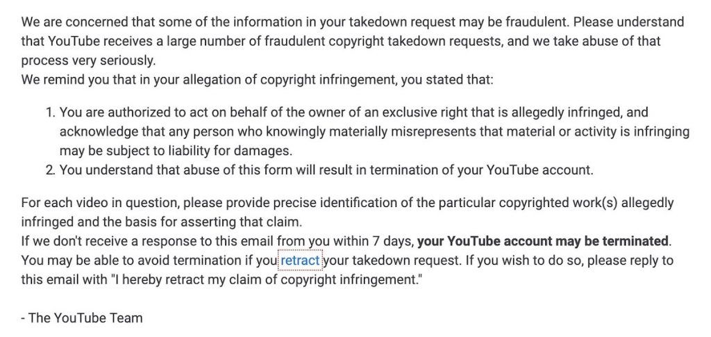 If you receive one of these emails from us, it’s important that you reply with the requested information. This is especially critical if the email indicates that we suspect abuse of the copyright takedown process, as not responding to one of these emails within a week may result in the termination of your YouTube account.