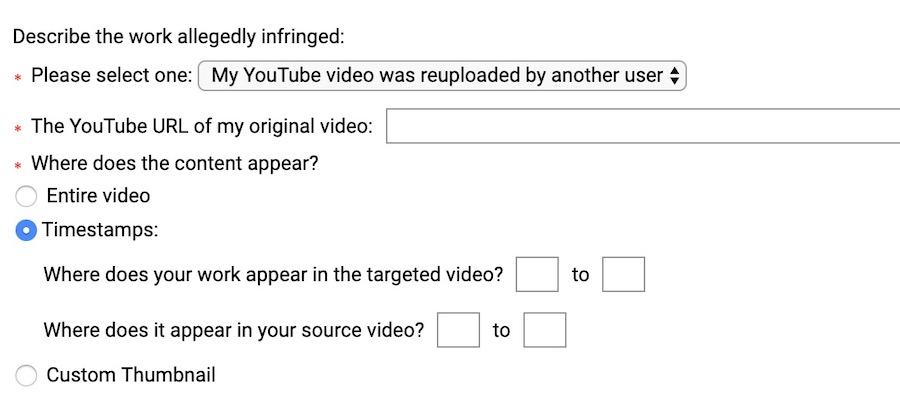 In the past few months, YouTube has made some changes to make the system less prone to abuse. Since this user didn’t reupload the whole video and used just some still images, you will need to point out one duplicate part in the two videos. I entered exact timestamps of the image in the infringing video and the original part in my video. And following is the confirmation after submitting the complaint: