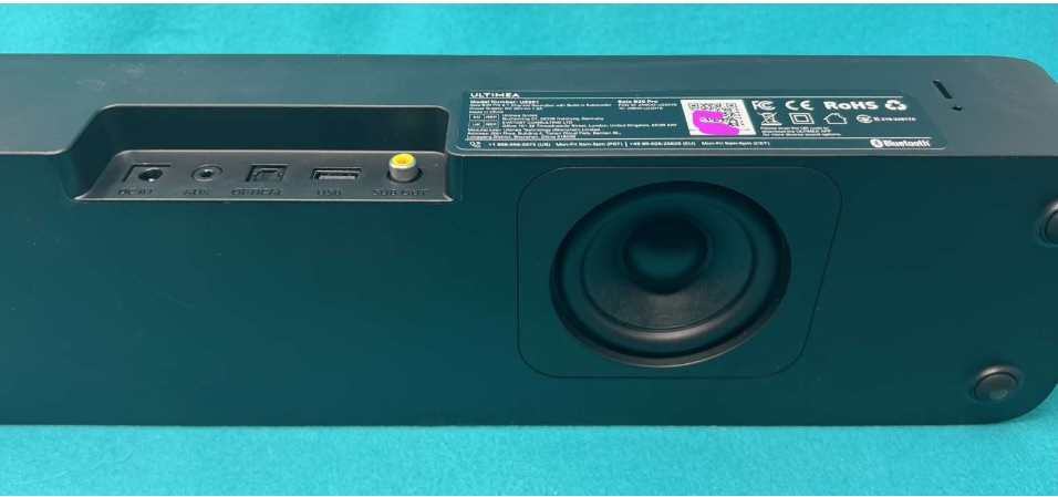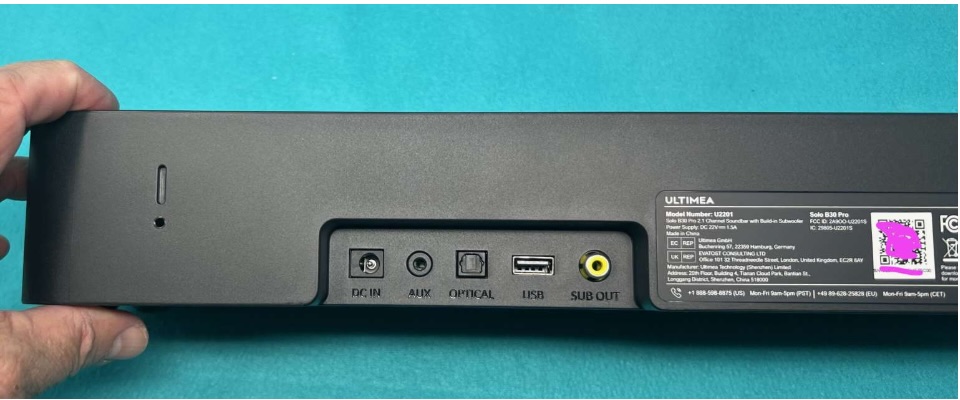 The Ultimea Solo B30 soundbar is a semi-glossy black plastic box with a black metallic screen across the front. It measures 15.75″ x 4.25″ x 2.375″. On the bottom is a 3″ bass speaker, which gives adequate bass for movies or podcasts, but is not gonna rock your room if you’re playing games, rocking some bass-heavy hip-hop, or wanting a big theatre action movie sound. But it’s better than most mid-sized TVs I’ve experienced.